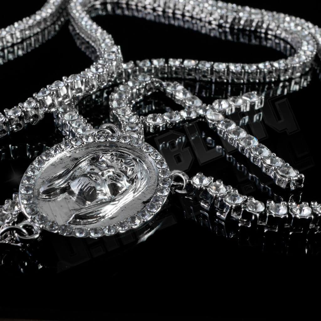 One of the hottest hip hop pieces in the game, this white gold 1 row iced rosary chain is perfect for hip hop lowers and the religiously devoted. Over the years hip hop has embraced this catholic item. Countless rappers like Jay-Z , J Cole , and the Game have rocked iced rosaries. This uniquely simple white gold 1 row iced rosary, will add bling to your style. This piece has the right length and the amount of ice to show off your outfit.