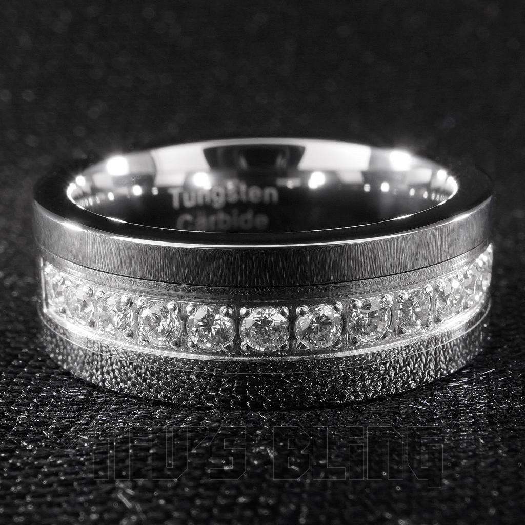 This beautiful tungsten carbide ring has a row of stunning CZ stones to brighten up your loved ones life. Present the person you love with this amazing ring while having the peace of mind that they are wearing a high quality tungsten carbide ring! This ring is 8mm in width and features "comfort fit" so the user doesn't have to deal with the irritating feeling that most rings give. Every ring is engraved with a "Tungsten Carbide" logo on the inside and comes with a complimentary jewelry box.