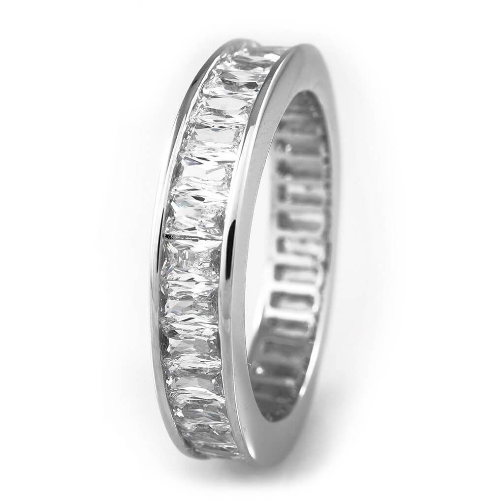 This white gold baguette cut eternity ring is suave, classy and elegant. It's modern and exquisite look will make this an unforgettable gift to someone you love. This gorgeous ring is everything you want it to be. Sexy, shy, playful, powerful, sophisticated – you can turn this ring into anything according to your mood, or dress for the day. A classic choice that you can't go wrong with.