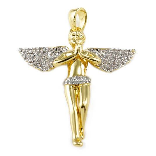 This Gold Praying Mini Angel Pendant is the perfect pendant for anyone who is looking for a small iced Angel Pendant. The angel pendant is posed in a symbolic prayer and accented with ice on the wings as well as the skirt. This combination of ice makes the gold praying mini angel pendant the perfect flashy yet small pendant to spice up your outfit as well as any outfit in your wardrobe.